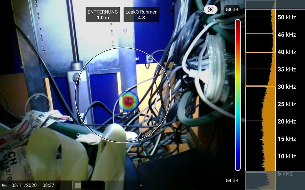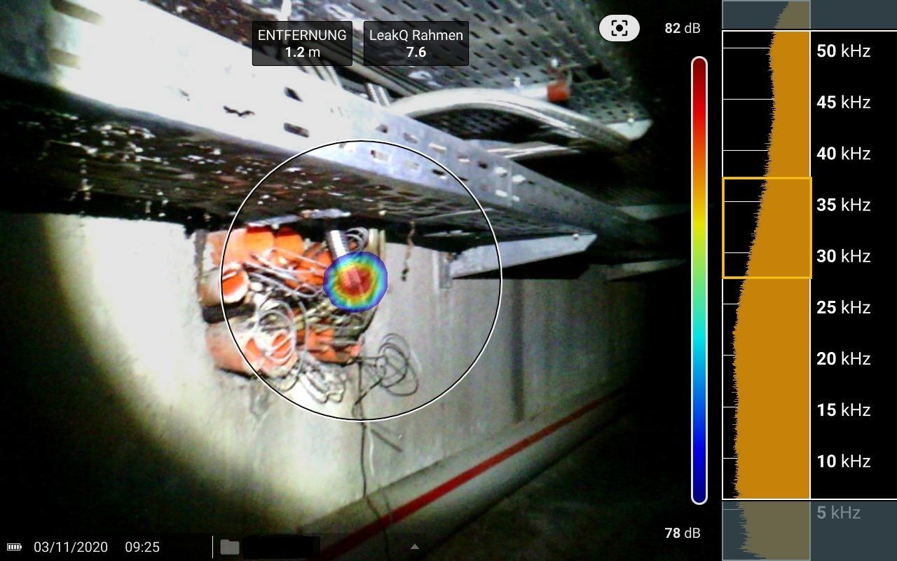 Mit einer Schallkamera sind wir in der Lage, Leckagen an Druckluft, Gas- oder Dampfsystemen schnell und sicher zu erkennen. Schallwellen von Leckgeräuschen im Frequenzbereich von 2 bis 52 kHz werden durch Berechnung der Schalllaufzeiten auf einem Kameradisplay angezeigt und können bei Reichweiten bis 50m lokalisiert werden. Nach der Lecküberprüfung von Druckluftanlagen erhalten Sie einen Bericht mit den lokalisierten Leckstellen inkl. einer Klassifizierung der Leckgrösse.